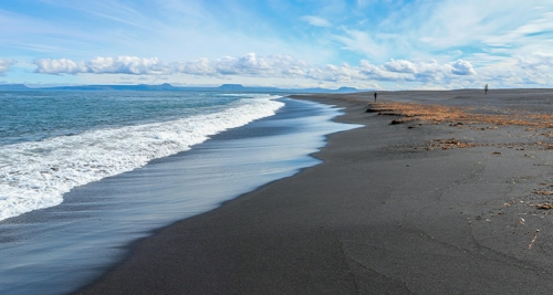 黑沙滩,其是火山爆发后冷却的黑曜岩被风化后所形成的沙滩。由于它黑得天然,黑 得通透,海水在丝毫未受影响的情形下依然清澈,在阳光下泛着金色的微光。进入黑沙滩有两个入口。其中一个是开到Vik后,从 Reynishverfisvegur转进去,这里可以看到整片的黑沙滩,还有一大排玄武岩组成的石头。