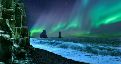 我们参观了 Reynisfjara 的黑沙滩,那里的大西洋海岸线呈现出巨大的海浪,冲击着沙子上方悬崖上独特的玄武岩柱。远处可以看到 Dýrhólaey 的悬崖。南部的这个地区也是鸟类爱好者的天堂,夏季,海雀、剃须刀和数十种其他物种在这些悬崖上筑巢。