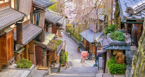 【祗园·花见小路】古老的著名花街,上世纪60年代,京都的艺伎近千人,至今仍有数10位艺伎教师进行传统茶道、花道、古琴、雅乐、狂言、舞妓、文乐等培训。走进花街,一种古风扑面而来:两边一间间门面精巧的茶屋,一扇扇木格子窗门紧闭着…这是一条南北横贯的神秘小路,全长约1公里。北段现代,南段传统,南北各有风情,各领风骚。
