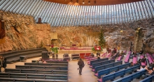 岩石教堂是从一整块岩石中开凿出来的,站在教堂外,映入眼帘的是一块巨大的岩石。教堂的屋顶由100条放射状的梁柱支撑,同时镶嵌透明玻璃,丝毫感觉不到身处地下。由于大厅呈环形,音响效果非常好,适合小型乐队和无伴奏合唱团演出。