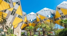 立体方块屋由荷兰知名建筑师布洛姆(Piet Blom)设计,共由38座明黄色的方块房子组成,在蔚蓝天空下发出耀眼的光芒。立体方块屋自1982年开始建造,于1984年完工,设计完成的方块屋就像是一棵抽象的树,而整个社区就像一片森林,因而得名“树屋”。立体方块屋展示了形式、美学和空间效果,看似倾斜,只有一点安置在柱子上,因此三面向着地面,另外三面向着天空。立体方块屋建筑群始终以其独特的造型吸引着荷兰本土以及世界各地的游客。