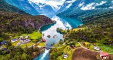 早餐后来到欧洲大陆最大冰川约斯特谷冰川(Jostedalsbreen)的分支【博雅布林冰川】(Bøyabreen Glacier),悬挂在陡峭的山壁上。最高点海拔1700米,与最低点之间有1400米的落差。终年冰封的高山积雪经重力的压力,形成如同河川般冰雪蓝色结晶的地理景观。之后游览附近的【冰川博物馆】,被认为是建筑师利用景观而非借助外来物的典范。众口交誉的建筑本身,曾获数项大奖包括挪威建筑学最高A.C.HouensFund金奖。博物馆通体灰色,设计中充分考虑了地形、地貌和季节因素,如北欧的光线、灰色的石头、苍翠的森林等,将现实和虚幻协调一致,创造出堪称时代经典的作品。之后前往奥勒松,奥勒松坐落在挪威默勒一鲁姆斯达尔郡的三个岛屿上,是通往盖朗厄尔峡湾的入口。游览海滨小镇【奥勒松Alesund】,夜宿峡湾小镇酒店。