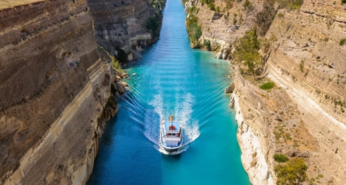 科林斯运河于1881-1893年间开凿而成,它缩短了从亚得里亚海到比雷埃夫斯的航程320 公里,具有重要的航运意义。从远处看,运河像一条狭窄细长的水道,但当船只逐渐靠近并进入运河以后,它的规模才显现出来。科林斯运河中只有6.3公里长,运河水面宽24米,底部宽21米,但深度达79米,运河内的水深8米,是世界上开凿最深的运河,并且是极少数在坚硬岩石区开凿出来的运河之一。
