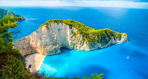 扎金索斯岛是位于希腊地中海沿岸,有世界最美海岸之称的沉船湾,《太阳的后裔》的拍摄地点,1983年走私船Panagiotis号在运送香烟时失事搁浅于此,自此得名“沉船湾”。陡峭的悬崖和澄澈蔚蓝的海水,辽阔的沙滩上,洁白的细沙反射着太阳的光芒,与清澈的海水交相辉映,令人陶醉。附近有一个“蓝洞”因岩石海藻和阳光的完美结合而非常有名。