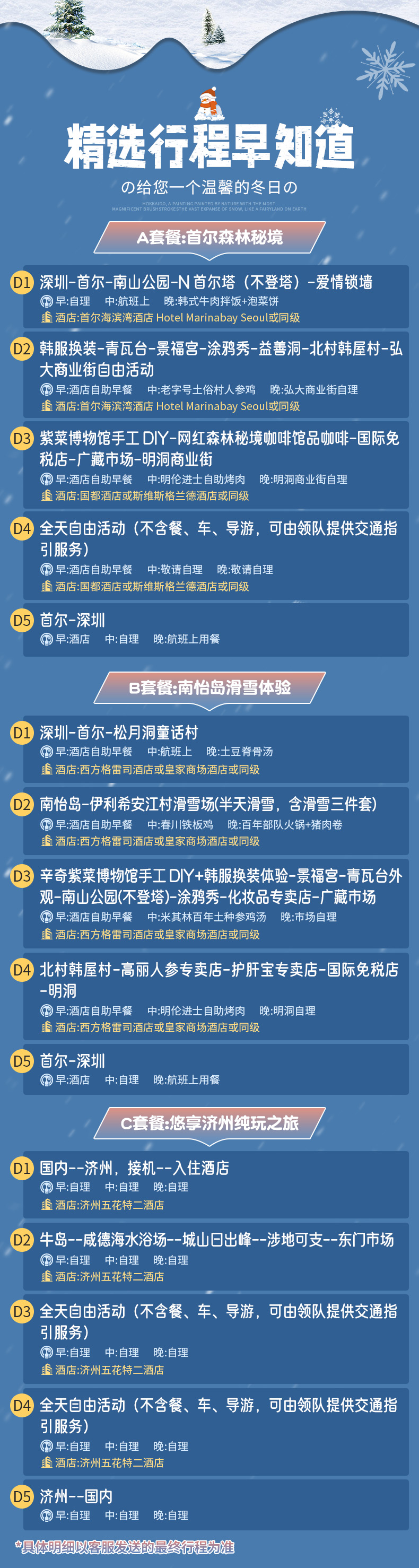 5、行程中旅游景点和餐食都是提前预定好,如客人临时取消行程将不退还任何的费用,敬请留意。