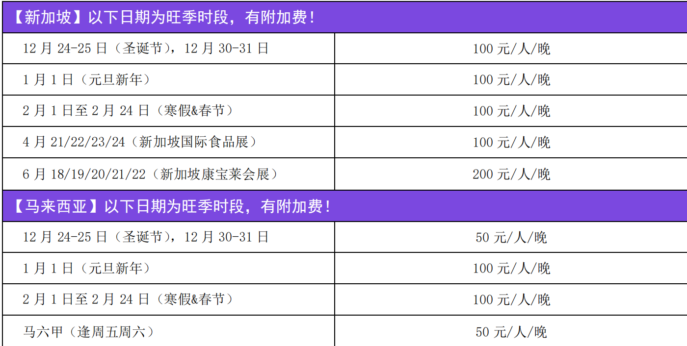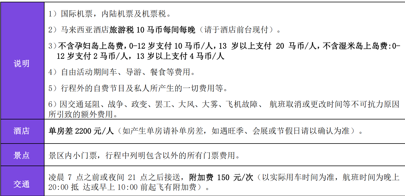1.行程中无指定购物点.(行程内经过的景区、餐厅、商场、集市、中途休息站等的商店,不属于旅行社指定购物 店,旅行者自行购买出现的质量问题,旅行社不承担任何责任) 2.新加坡以及马来西亚海关最新规定,不允许带香烟(含电子烟)入境,否则一切后果自负!无论何处入境新加坡都 不可携带口香糖,客人在冷气场所及公众场合不可吸烟,违反重罚,旅行社无法提供任何援助,敬请务必留意。 3.发放签证及批准入境系国家的主权行为,如持有效签证或进入免签国,因个人原因无法出境或被目的地国拒绝入 境,系不可抗力因素,其旅费损失不能退回,所产生的其它经济损失由当事人自理,我司概不负任何责任及作任 何赔偿。 4.由于不可抗拒原因而取消行程(包括但不限于航班取消、自然灾害、战争、罢工等),我司将根据相关规定做退 团处理,不再承担其它赔偿。谢谢理解! 目的地介绍: 所属国家/地区:新加坡/马来西亚 首都:新加坡/吉隆坡语言:新加坡主要以英语、华语 马来西亚主要以华语、马来语、英语 时差:无 货币:新加坡主要以新币;马来西亚主要以马币 天气: 新加坡位于赤道附近,应该属于热带雨林气候,气温应该在 30 度左右,降雨多,并且多出现在午后,四季相同。 马来西亚属热带雨林气候,位置近于地球赤道,故其气候为热带气候,常年炎热而多雨,空气中的湿气非常高。 旅行服装:休闲轻松的夏季服装为最适宜。 打电话:从中国打去新加坡为:00+65+区号(例如上海 0065+021)+电话号码,从新加坡打回中国则为:00+86+区号 去 0(例如上海 21)+电话号码。 从中国打去马来西亚为:00+60+区号(例如上海 0065+021)+电话号码,从马来西亚打回则为:00+86+区号去 0(例如 上海 21)+电话号码 海关:免课税品只限於个人消费,禁止转售或赠与。如果携带入境的物品超出免税范围,超出部份将被课税;转机 过境旅客若携带过量的物品其超出免税范围的物品必须存放於海关,并且自行负担保管费。免课税品只限於个人消 费,禁止转售或赠与。如果携带入境的物品超出免税范围,超出部份将被课税;转机过境旅客若携带过量的物品其 超出免税范围的物品必须存放於海关,并且自行负担保管费。 电压:供电电压为 220-240 伏的交流电,频率为 50 赫兹 插头简介:新加坡、马来西亚使用的是英式三插 IDD 码:新加坡 65;马来西亚 60 旅游贴士: 新加坡:饮食:主菜以鸡肉和羊肉为主,大多数以印度菜和东南亚风味菜为主,还有中国菜和欧美式 菜;要带好你要到的地方的地址,填入境卡里需要填写的;入境时若觉得自己英语不怎么流利,只要找一个入境官 看着华人的柜台说普通话就 OK;入境。在网上看到攻略说去新加坡不一定要会说英文,入境时只要找一个入境官看 着是华人的柜台说普通话就 OK。马来西亚:马来人相互拜访时,必须衣冠整齐。如果是穿着拖鞋,首先必须脱掉放 在门外,因为马来人的内厅是供祈祷的地方。游客也须这样做;交往忌用左手,马来人认为左手是不干净的,拿东 西给别人不能用左手,要用右手。 紧急救助电话:999 当地特产:鱼尾狮纪念品、镀金胡姬花、鳄鱼皮制品、猪肉干、铅锡制品、蜡染,锡制品、巴迪蜡染布、银制品、 风筝、手工织品、雕刻画、蝴蝶标本 当地风俗:在新加坡,进清真寺要脱鞋 在一些人家里,进屋也要脱鞋 由于过去受英国的影响,新加坡已经西方化 但当地人仍然保留了许多民族的传统习惯,所以,打招呼的方式都各有不同,最通常的是人们见面时握手,对于东 方人可以轻轻鞠一躬。马来西亚是一个多元文化国家,伊斯兰教、佛教、印度教等多种宗教并存,形成了马来西亚 多姿多彩的文化特色。马来人见面时相互握手,然后双手触摸胸膛以示真诚。马来男士一般不主动与女士握手,除 非女士主动握手。左手被马来人认为是肮脏的,因此在接、递物品时应用右手。马来人习惯用大拇指指人或指路忌 讳用食指,不翘二郎腿,不用手抚摸小孩的头。马来人忌食猪肉和禁酒,也忌讳印有动物或人像图案的物品。 温馨提示: ● 参加出国境旅游前敬请各位游客务必对自身的健康状况进行评估;60 岁以上的老人参团需有直系亲属的陪同; 所有游客参团时请如实告知旅行社身体状况,患病游客和孕妇不得参团,由此引发的问题由游客自已承担;境外 旅游期间财物及证件请随身保管,车上不可放贵重物品。 ● 游客在自由活动期间,应当选择自己能够控制风险的活动项目,并在自己能够控制风险的范围内活动,同时按相 关规定做好安全防范措施,确保自身财产和人身安全。 ● 特别提醒您在参加水上活动或乘船出海时,一定要按规定穿戴救生衣并做好安全防范措施,切勿单独下海游泳, 请结伴前行;水上活动项目存在一定的危险性,有心脏病、哮喘、高血压、心血管等疾病者,应根据个人身体状 况来选择性参加各项水上活动,确保自身安全,参加浮潜时,需向工作人员了解浮潜水域的水深情况及暗流情况, 建议评估风险后选择地势较平缓相对较浅的水域进行水上活动。 ● 团队游览中不允许擅自离团(自由活动除外),中途离团视同游客违约,需支付相应的违约金赔付旅行社,由此 造成未参加行程内景点、用餐、房、车等费用均不退费,旅行社亦不承担游客离团后发生的意外责任。 ● 发放签证及批准入境系国家的主权行为,如持有效签证或自备签证,因个人原因被目的地国拒绝入境,系不可抗 力因素,其旅费损