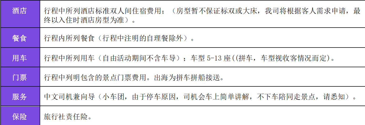 酒店集合专车送往机场,自行办理手续后乘机前往目的地,结束此次愉快的旅程! ***温馨提示*** 1)酒店已含早餐,如航班原因来不及用餐,费用不退;请自理早餐或飞机餐。 2)如您是下午或晚班机请于中午 12 点前办理好退房手续,行李可寄存在酒店前台,并根据你的航班时间安排送机。 3)注意:国际航班建议提前 3 小时抵达机场,自行办理登机及出境手续。 早餐:酒店早餐; ---旅行社有权根据实际情况变动景点游览顺序,遇景点维修等非旅行社控制因素,旅行社保留用其它相关代替景点的权利--- ---旅行社有权根据航班和当时天气、交通、客人反应等具体情况调整行程景点的停留时间