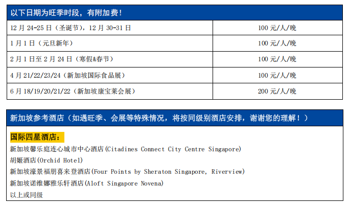 [温馨提示]酒店入住时间一般为当日14:00以后,如果您的航班在今天中午12点之前到达的话,可以自行在酒店周围逛逛,感受下自然之美与现代化都市完美结合的新加坡。新加坡是个弹丸小国,寸土寸金。新加坡四钻酒店面积一般在15-20平方米左右,五钻酒店一般在25-30平方米左右。相比国内的同级酒店面积要小很多。2-12岁儿童默认不占床不含早,如果您同行有超过1.3米以上的儿童或者年龄在8岁以上的儿童,住酒店建议您前台加床入住,加床费自理。