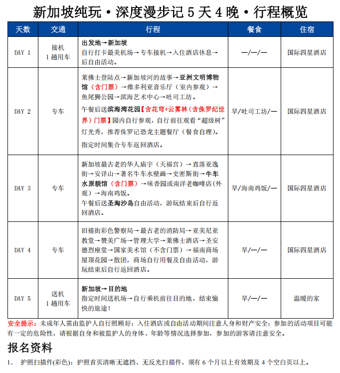 导游:新加坡导游+单趟中文司机兼向导(小车团,由于停车原因,司机会车上简单讲解,不下车陪同走景点,请悉知)。